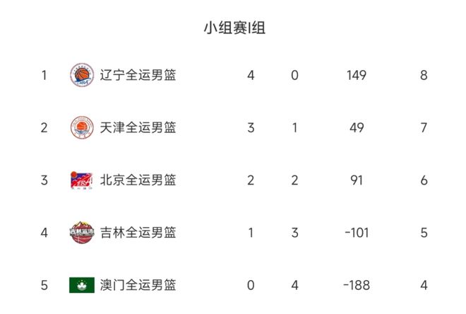 第1名,遼寧隊,成績?yōu)?勝0負,積8分;