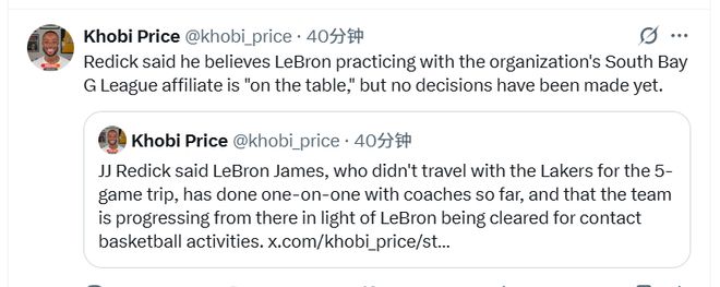 主帥雷迪克在訓練后更新了詹姆斯的情況。雷迪克透露,未隨湖人隊參加五連客之旅的詹姆斯,目前已與教練進行過一對一訓練。鑒于詹姆斯已獲準參與對抗性籃球活動,球隊正以此為基礎逐步推進他的復健進程。雷迪克還表示,他認為詹姆斯與下屬的發展聯盟球隊南灣湖人合練“是有可能的”,但目前尚未做出最終決定。