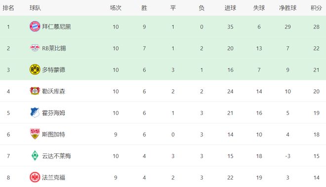 在積分榜上,拜仁以28分排名榜首,戰(zhàn)績是9勝1平,是德甲唯一保持不敗的球隊。萊比錫以22分排名第2,落后6分。多特蒙德排名第3,拿到21分。勒沃庫森大勝之后縮小與身前球隊的差距,以20分排名第4?;舴液D纺玫?9分,排名第5。第6的是斯圖加特,拿到18個積分。